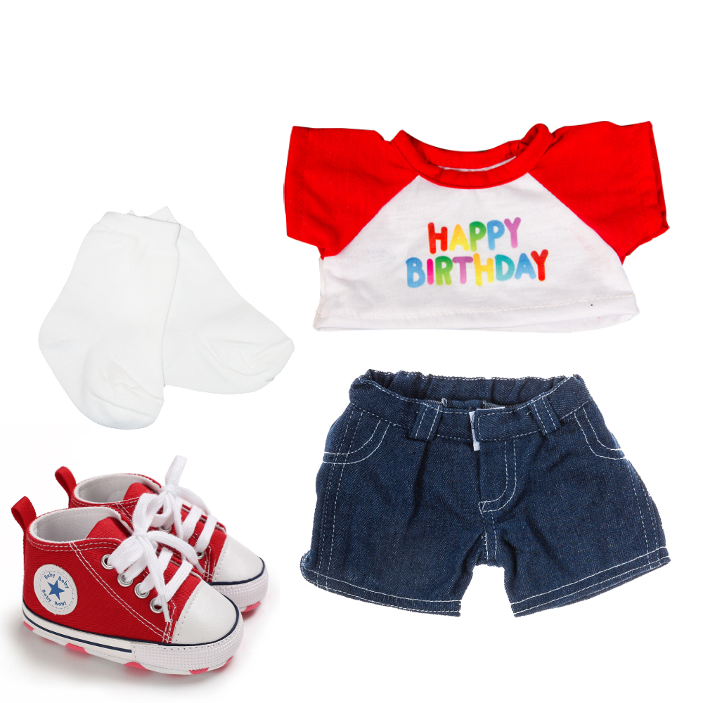 Happy Birthday T-Shirt, Denim shorts, White Socks and Red Tennis Shoes for 16″ Stuffed Animal